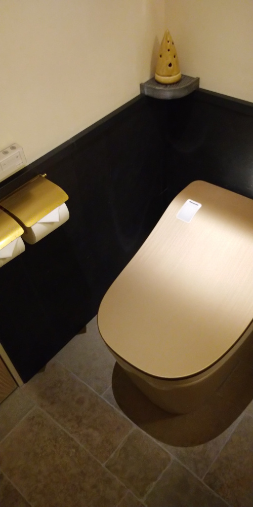 内装にも至る所に拘りがあるお店でしたが、その中でも、私はお手洗いが特に印象的でした。写真だと分かりづらいですが、便器の蓋が金色に輝いております。